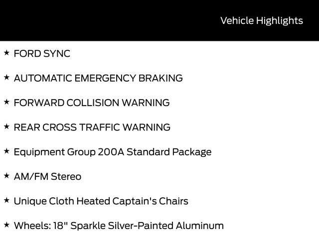 Stepping inside, you'll be greeted by a spacious and well-appointed cabin that seamlessly blends style and functionality. Unique Cloth Heated Captain's Chairs offer unparalleled comfort, while the 18" Sparkle Silver-Painted Aluminum wheels add a touch of sophistication to the exterior. The advanced technology features, including Apple CarPlay, Android Auto, and the FORD SYNC system, keep you connected and in control, while the comprehensive suite of driver-assistance technologies, such as Automatic Emergency Braking and Forward Collision Warning, provide added peace of mind on the road.